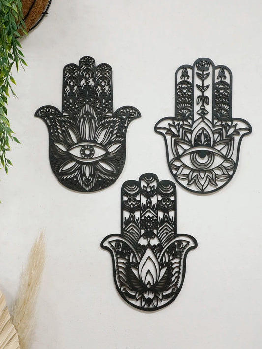 Wooden Gothic Hamsa Hand Wall Hanging – Evil Eye Ornament for Boho Home Decor, Dorm, or Table Display