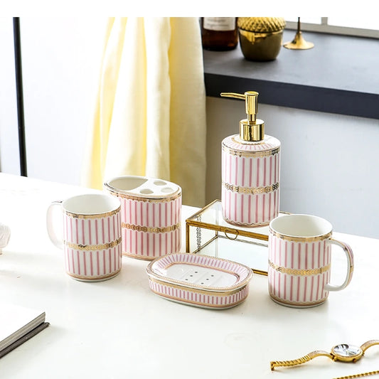 Ivory Porcelain & Gold-Plated Ceramic Bathroom Set – Pink Stripes