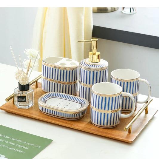 Ivory Porcelain & Gold-Plated Ceramic Bathroom Set – Striped Blue