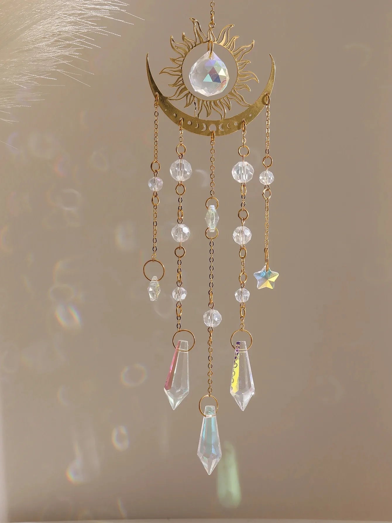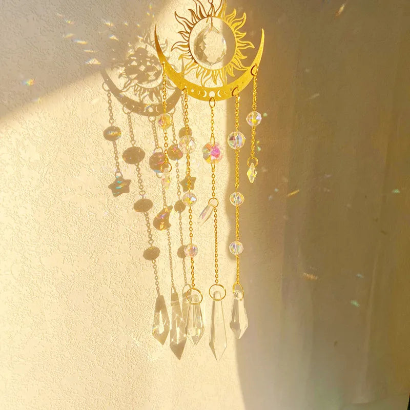 Add a touch of shimmer and celestial charm to your space with this Gold Flame Moon Crystal Suncatcher. Whether it catches the light in your garden, dances in your window, or hangs on your patio, this radiant ornament fills any space with magic. Its golden flame moon silhouette cradles a sparkling crystal that reflects rainbows when the sunlight hitsβperfect for boho-inspired outdoor and indoor vibes.