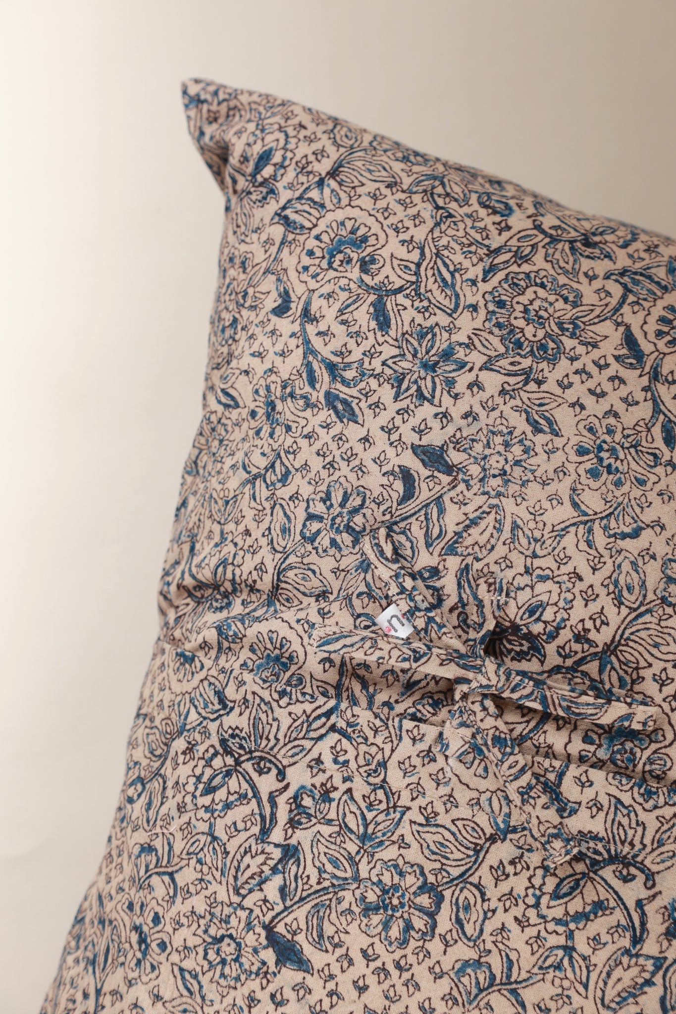 Elevate your home décor with our exquisite Kalamkari Hand Block Print Cushion Cover. Featuring a stunning floral pattern in subtle shades of blue and beige, this pillow cover brings a touch of artisanal charm to any living space.