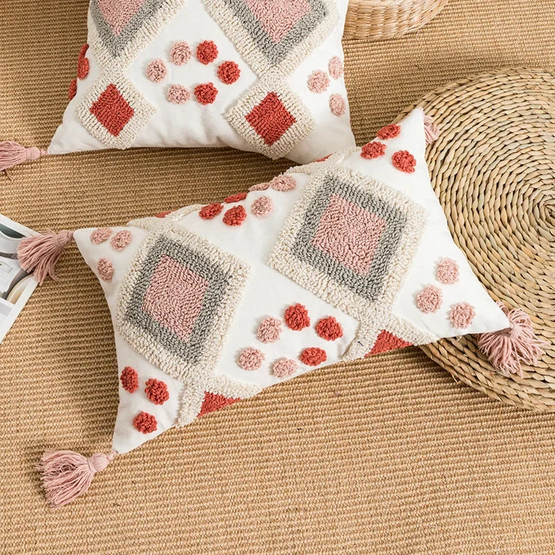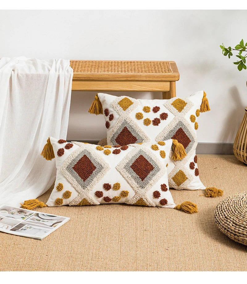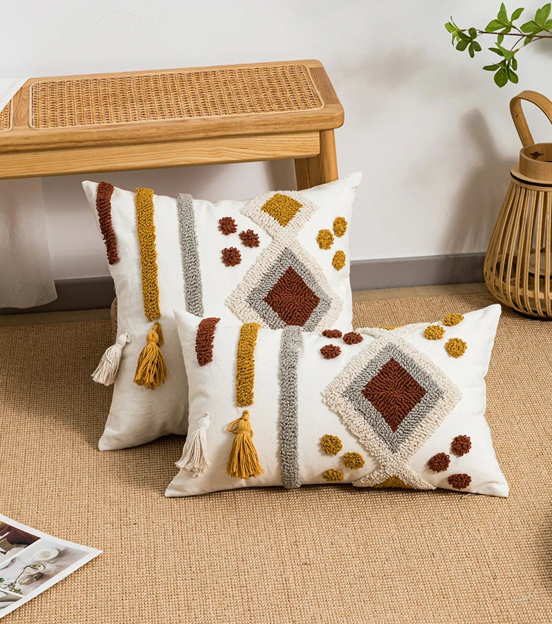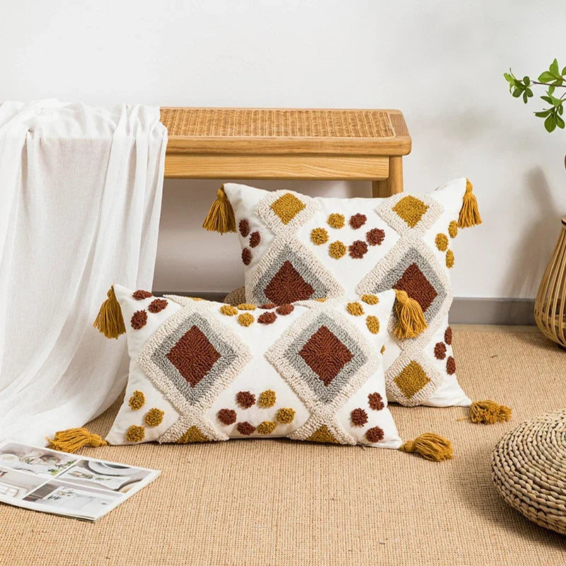 Add cozy bohemian charm to your home with this loop tufted cushion cover, crafted from a soft cotton-polyester blend and finished with embroidered geometric patterns and playful tassels. Perfect for living rooms, bedrooms, or lounge areas, this pillow cover brings texture, warmth, and a touch of ethnic-inspired artistry to any space.