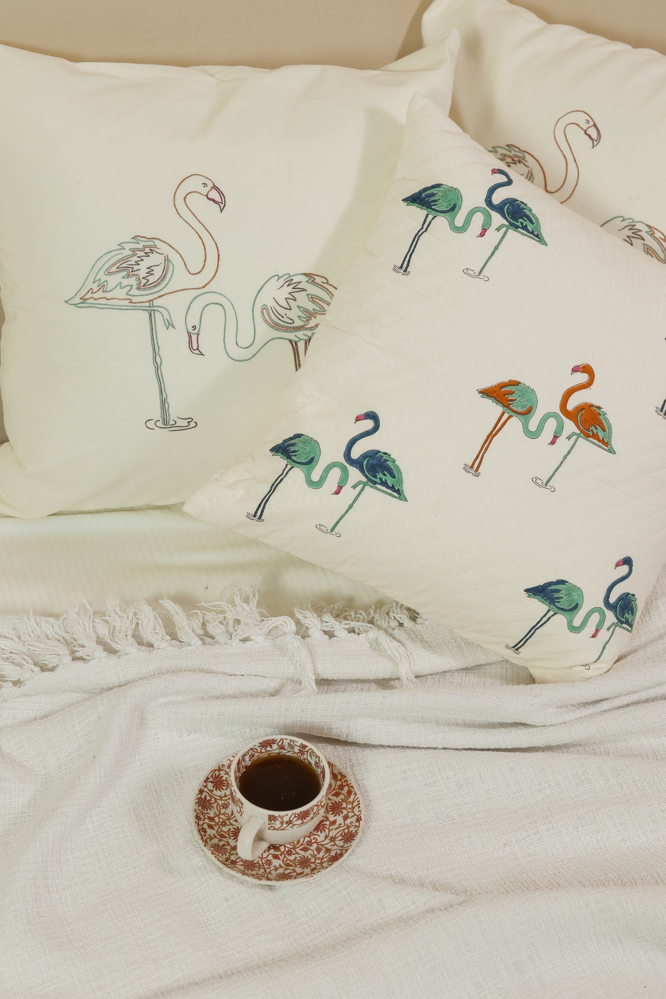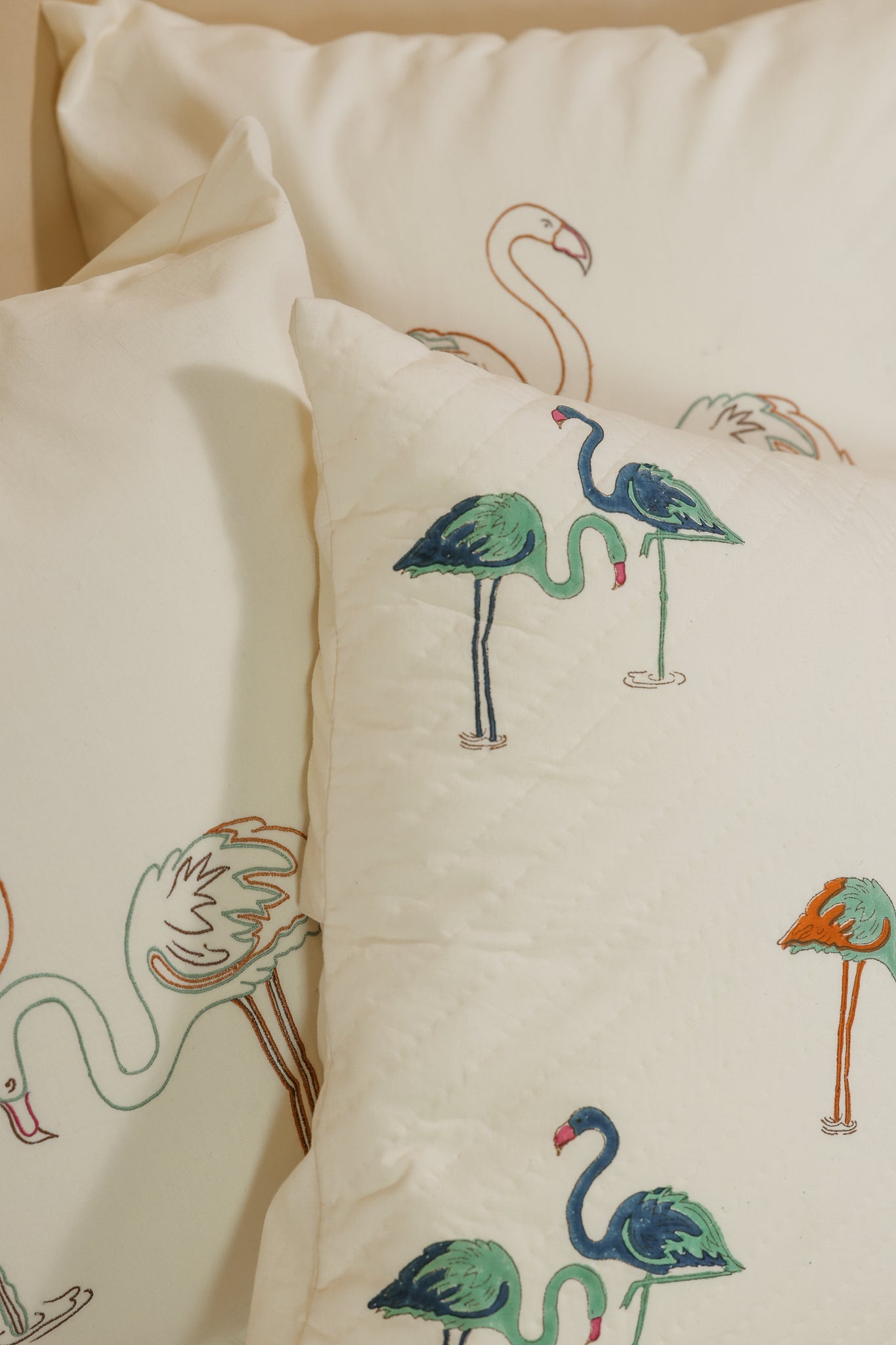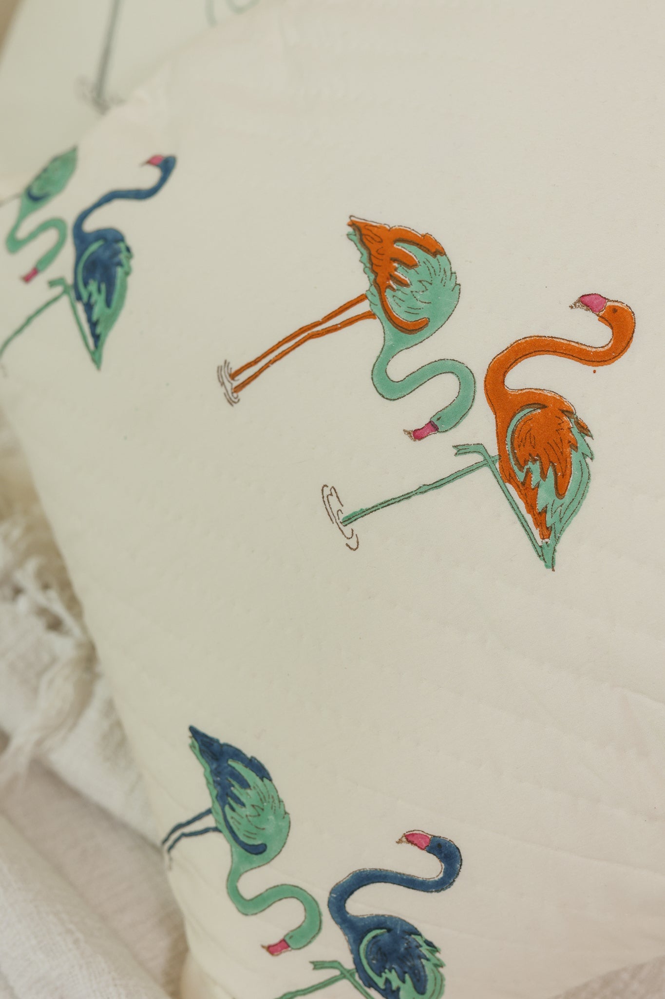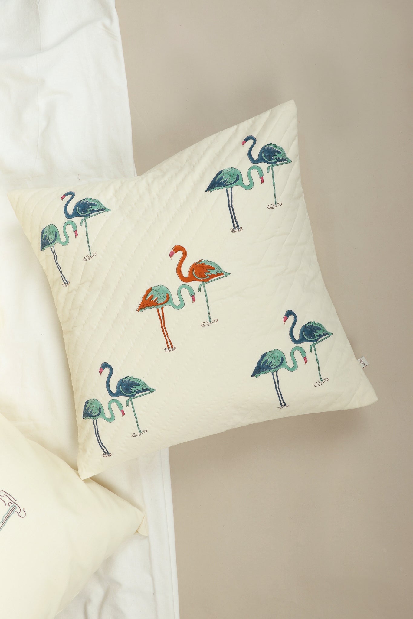 Off-white cotton pillow cover featuring hand-block printed flamingo motifs. Introduces a delightful touch of vibrancy, infusing your space with playful charm and quirky sophistication. Hand-stitched to form a quilted pattern on the front.
