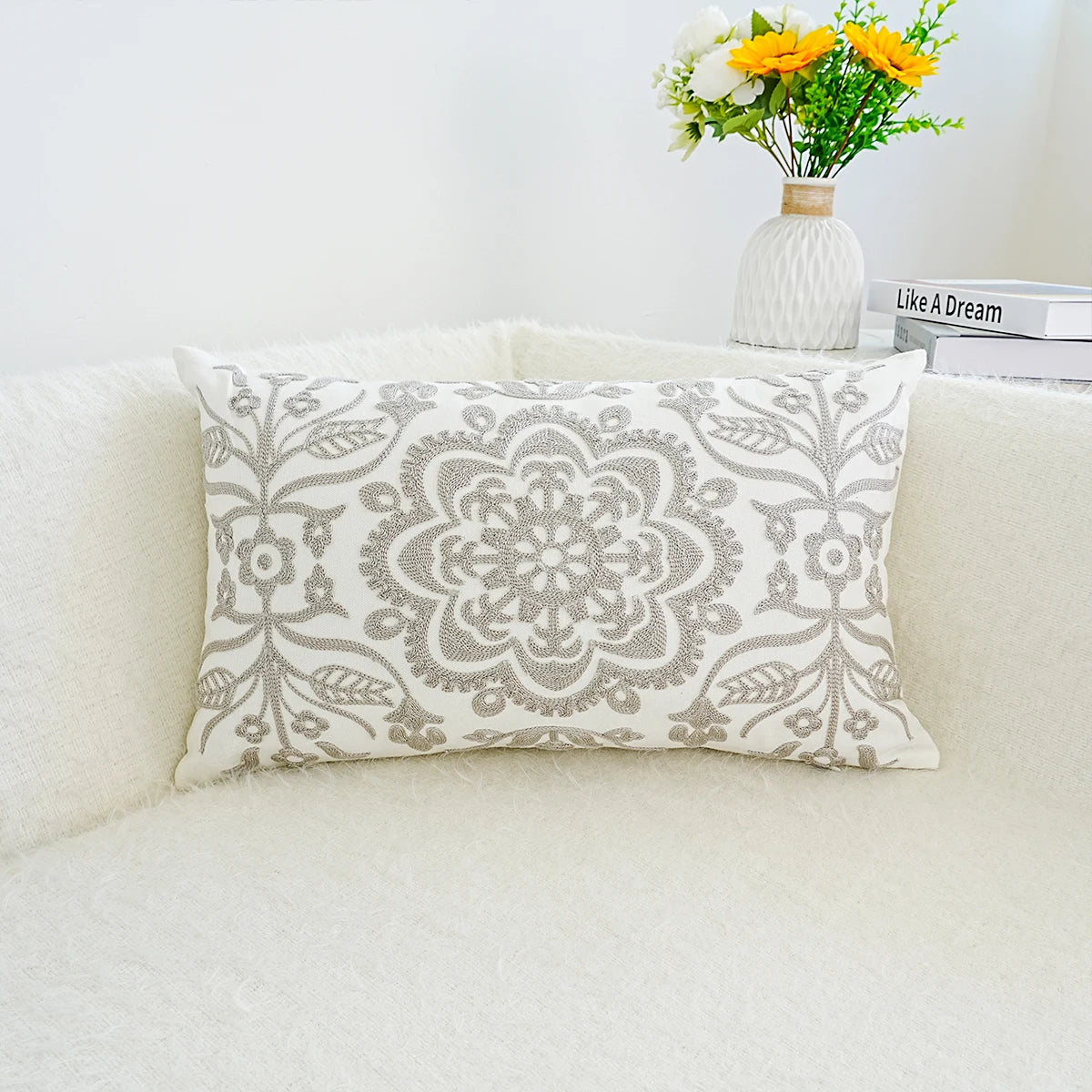 Gray Mandala Floral Embroidered Pillow Cover – Geometric Boho Home Decor Accent