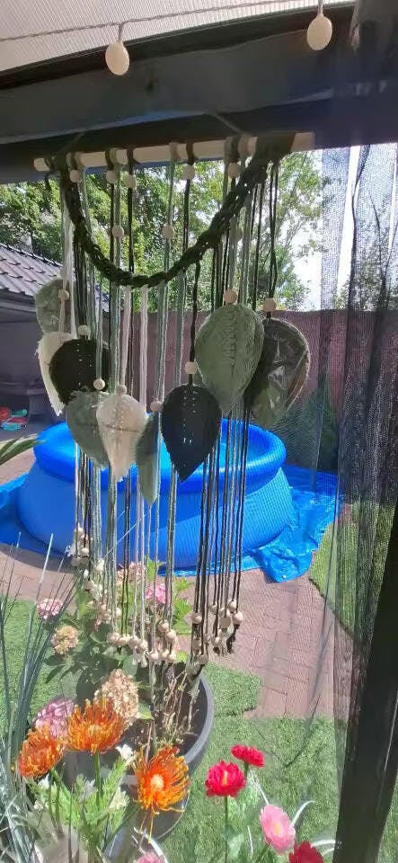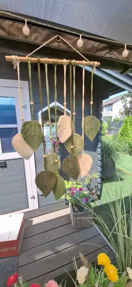 Hand-woven macrame with colorful leaf details for a vibrant boho aesthetic