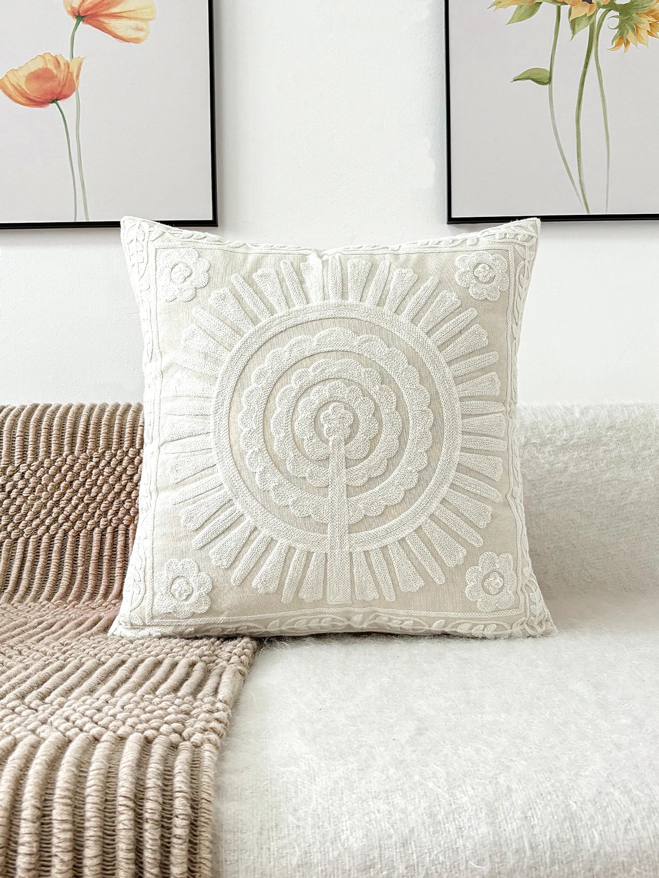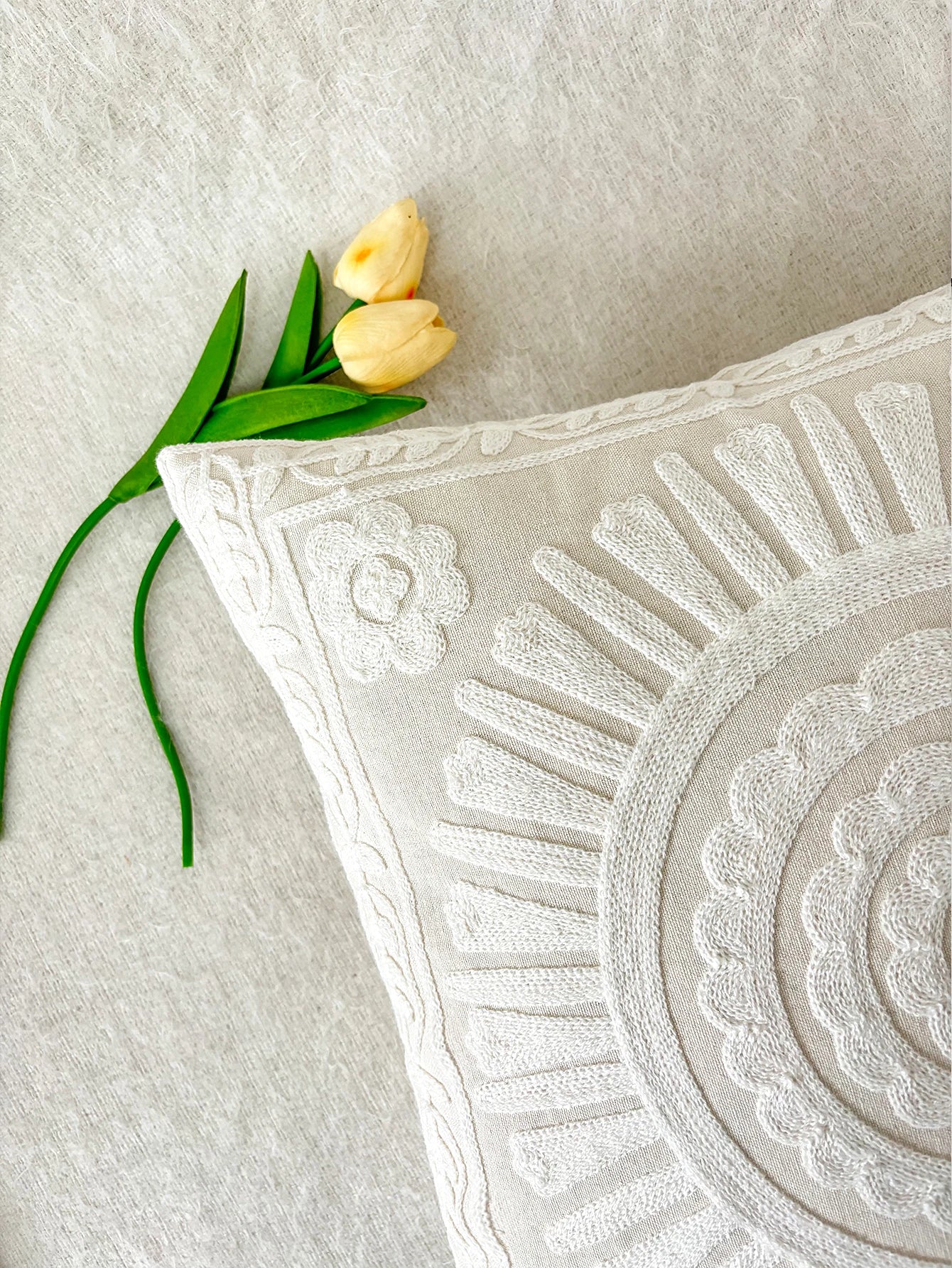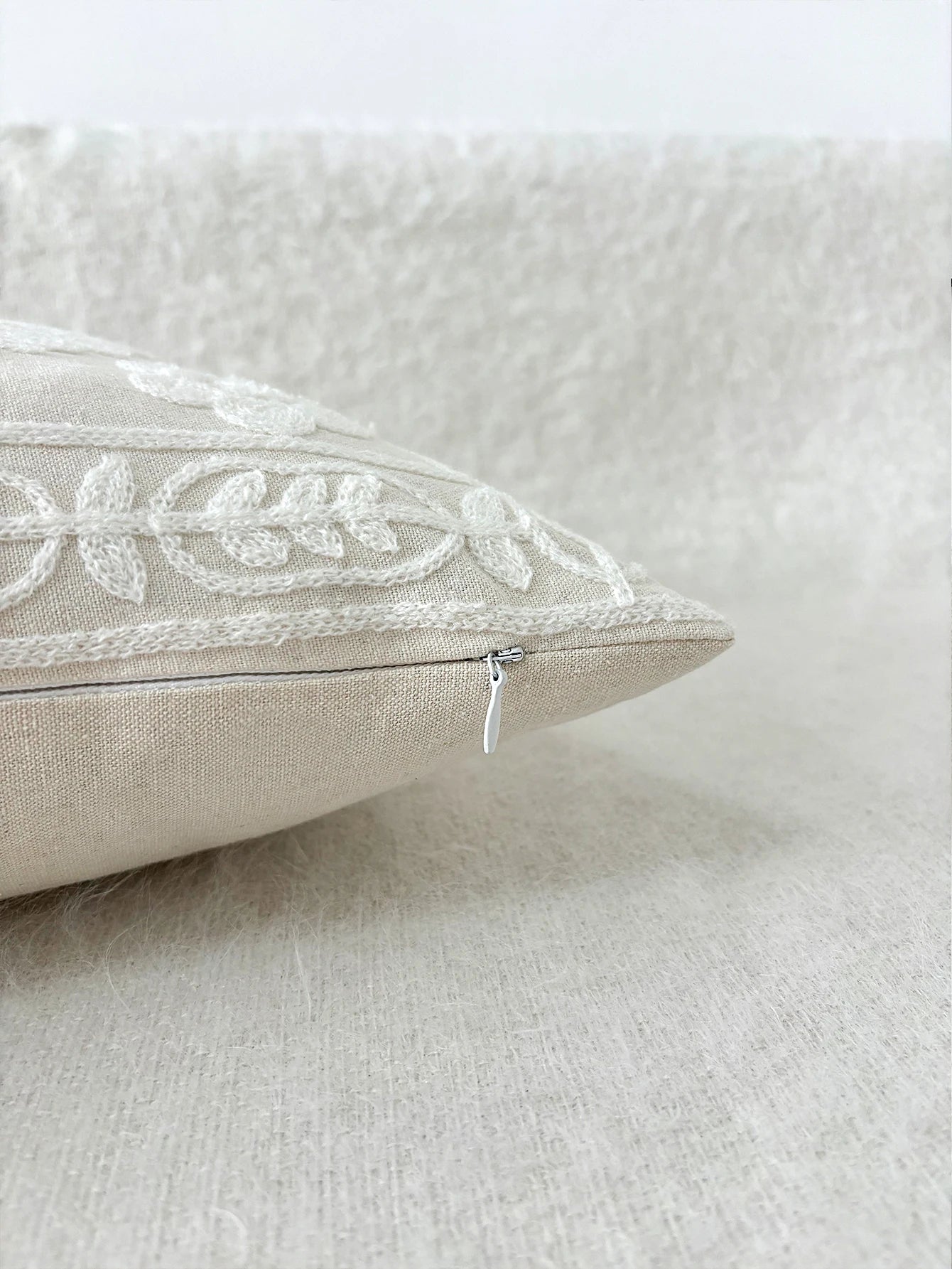 White French Floral Embroidered Pillow Cover – Elegant Boho Home Decor Accent